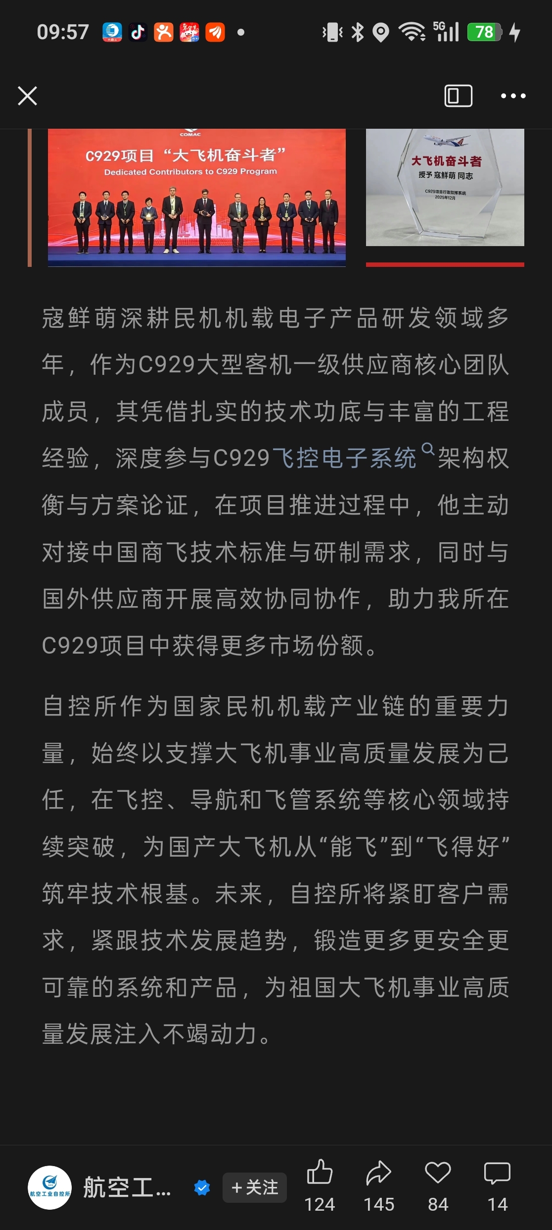 c929的机载系统是实现了国产化替代的,自控所是机载托管的,自控所的亲儿子(负责