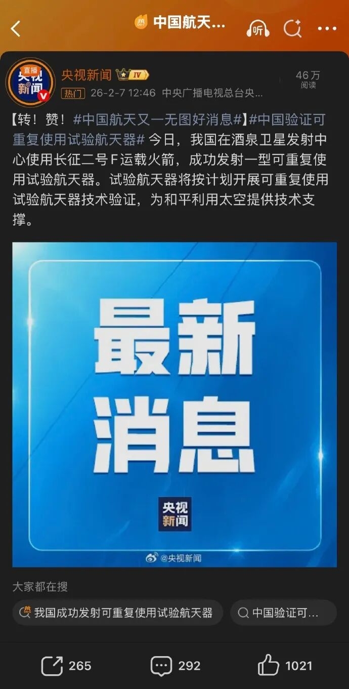 $中航机载(SH600372)$ 董秘公告过的昊龙无人飞船应该是发射成功了!中航机载是核心供应商!