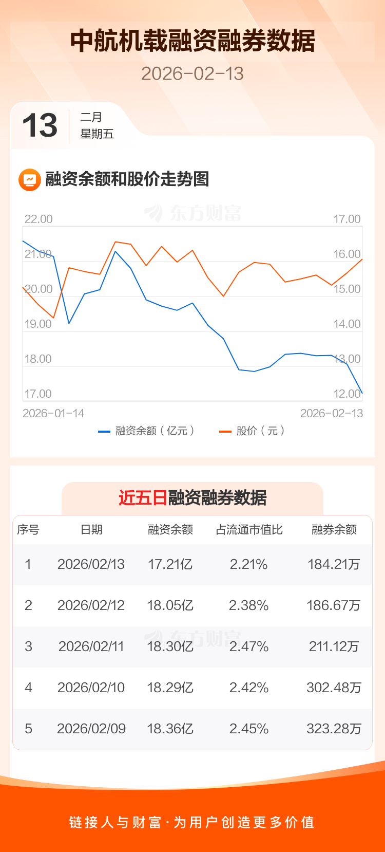 交易所最新数据显示,中航机载于2026年2月13日获融资买入2.13亿元,融资偿还2.97亿元,当日融资净偿还8396.35万元。目前,该股融资余额17.21亿,占流通市值比例为2.21%。