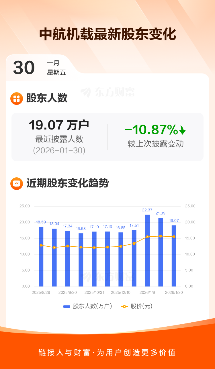中航机载:截至1月30日最新股东户数19.07万户,较上期减少10.87%