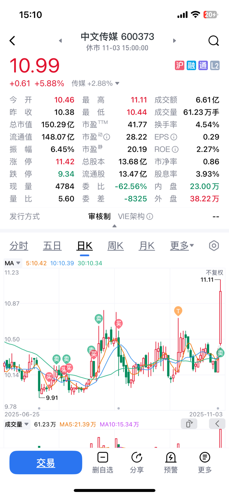 $中文传媒(SH600373)$ 放量了,后面我把握不住,留了2层仓位