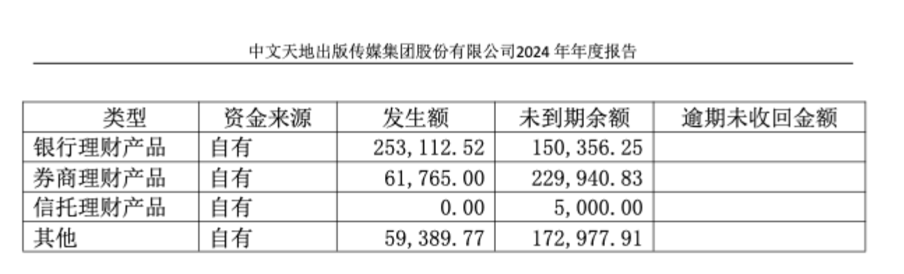 从理财产品的配置结构来看,中文传媒采取了多元化策略。2023年,其理财产品类型覆盖银行理财、券商理财、信托理财及其他非保本浮动收益类投资。这一多元化配置模式在2024年得到延续。