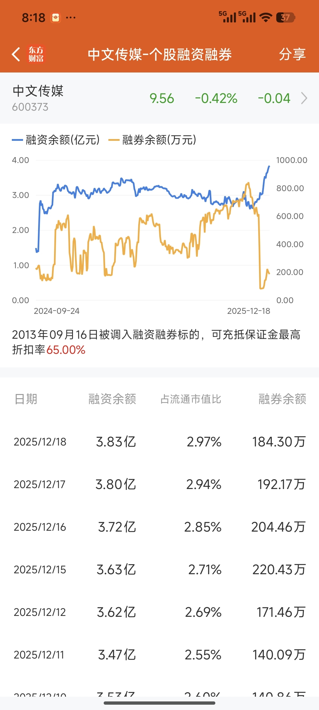 $中文传媒(SH600373)$ 融资大于融券太多,根本不在一个等级