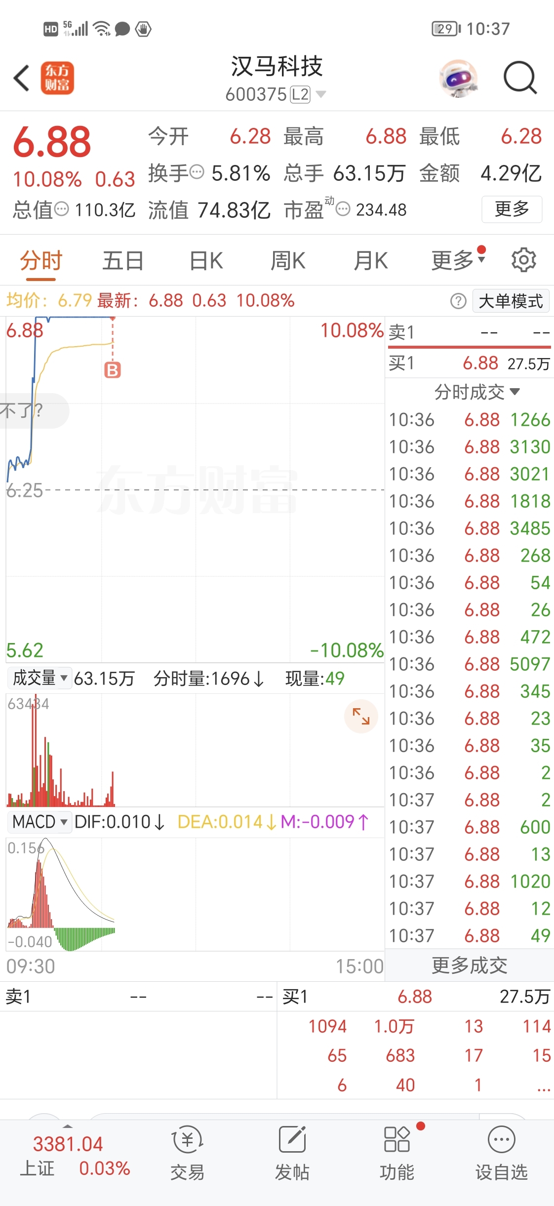 $汉马科技(SH600375)$ 进来了,想打板拿龙头要有信仰,一会怕开板,一会怕吃面就别买龙头,老老实实去抄底感受大A的长线就知道哪个方法好了。打板要么亏七八个点,打对了就是几个板