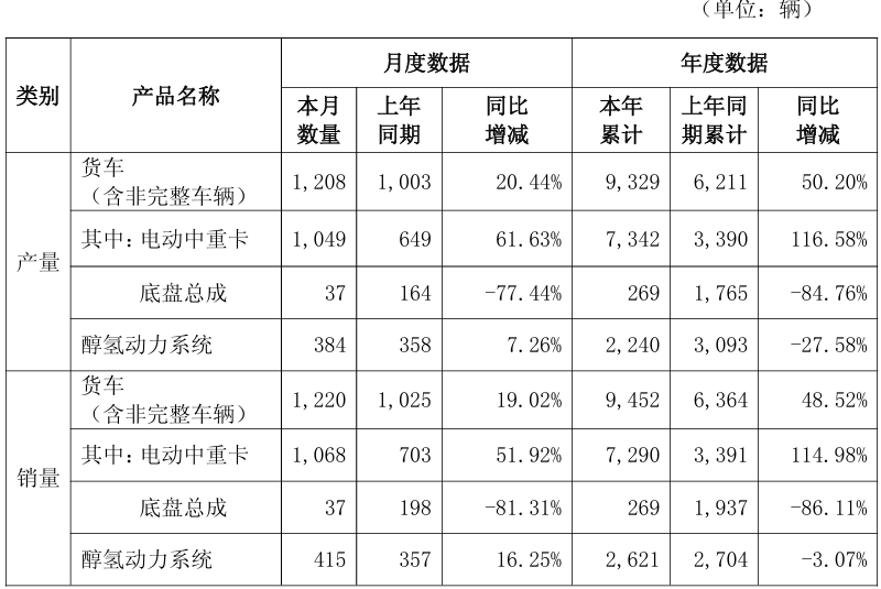 汉马科技9月货车产量1208辆 同比增长20.44%