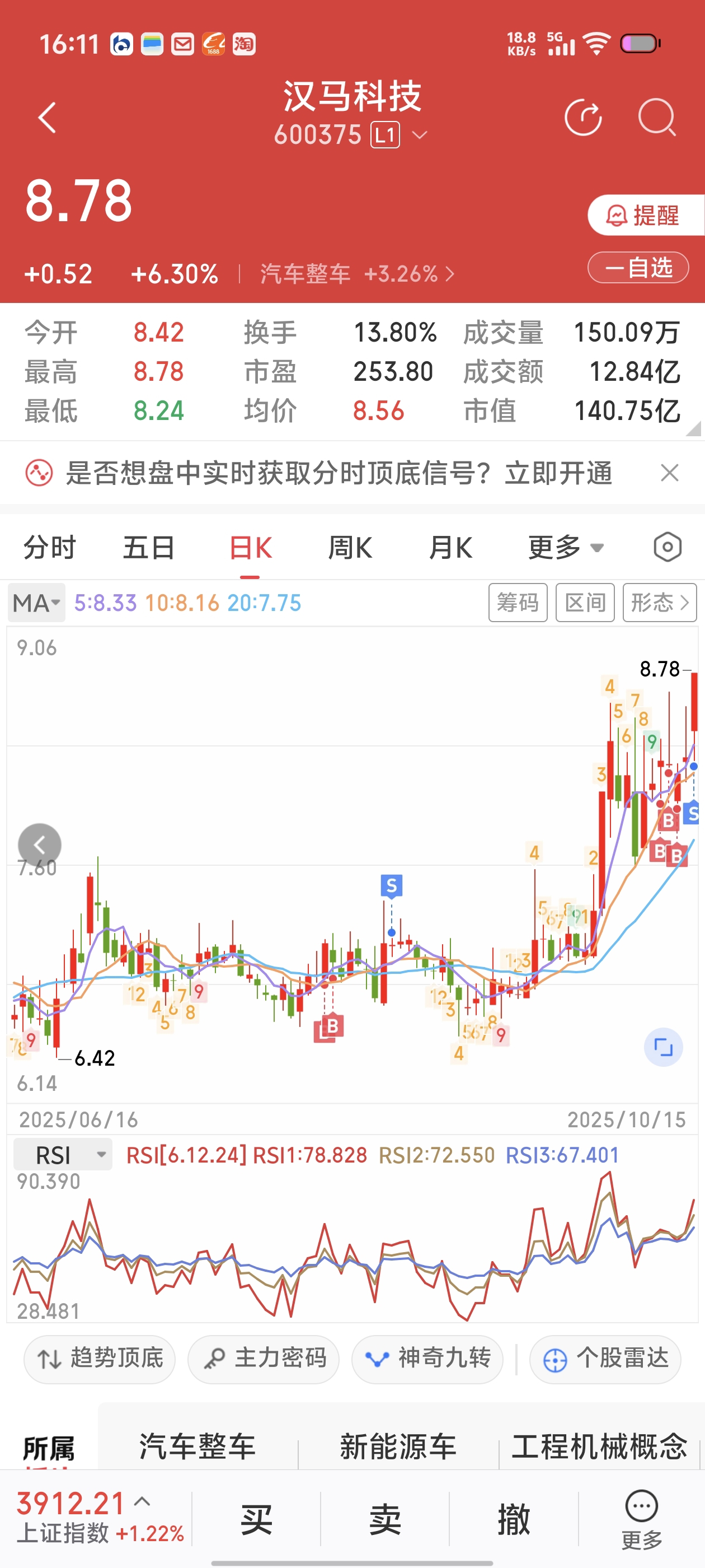 $汉马科技(SH600375)$ 不出意外应该卖飞了,这行情有点怕,突破很好,大家发财!先落袋为安了,小仓位15000股打野,几天六千盈利够了