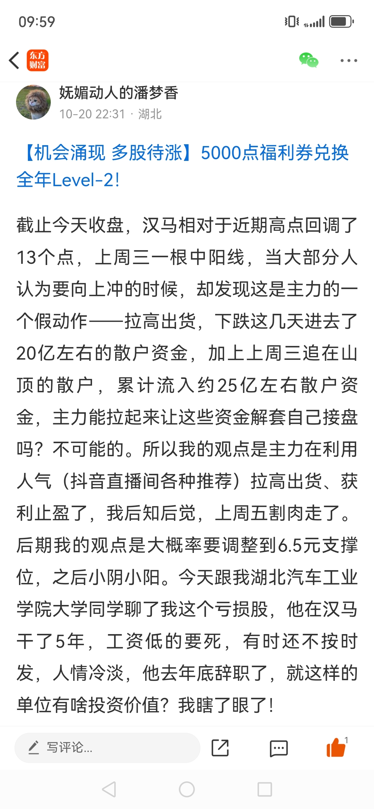 $汉马科技(SH600375)$ 好在周五亏了2万割肉了,半年的利润都被你搞没了!