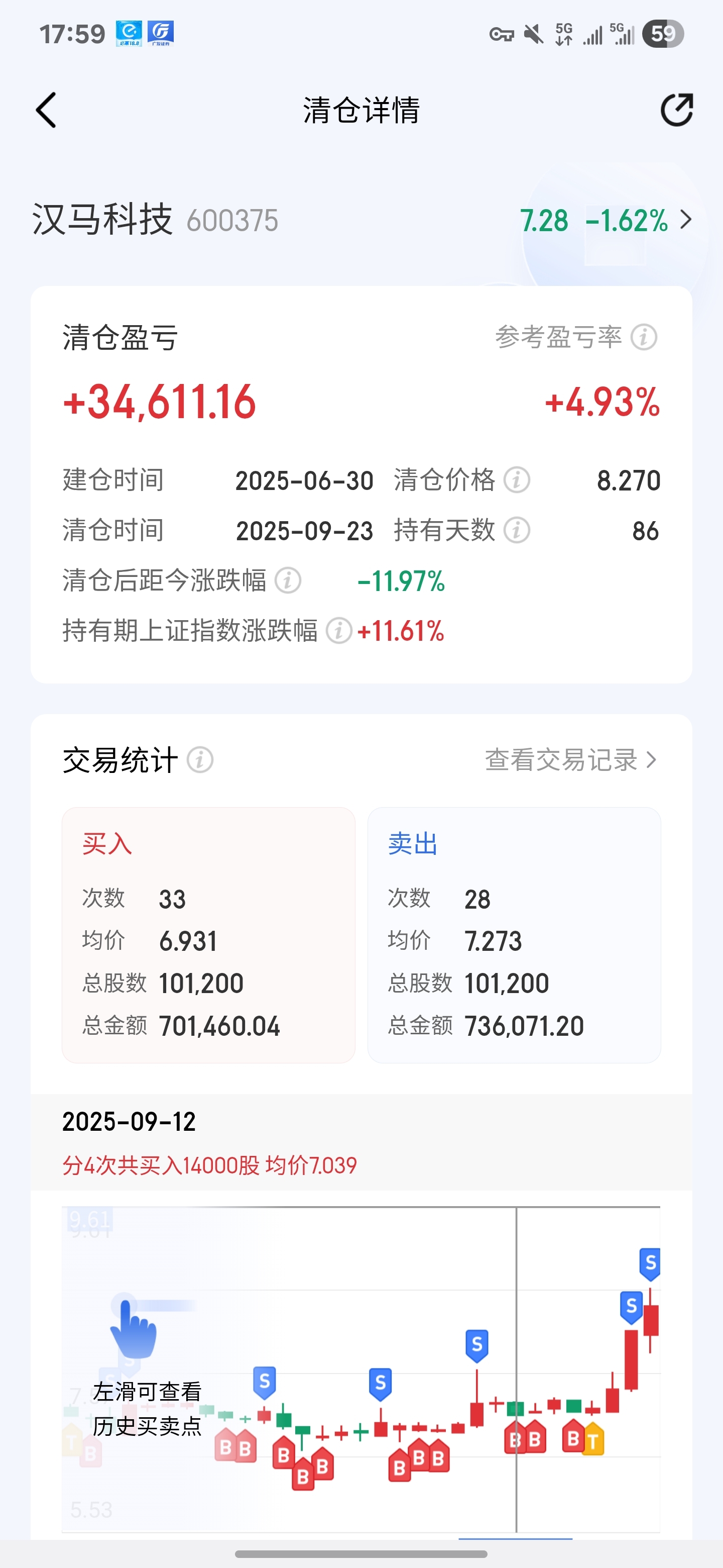 汉马9月涨停就割了。以为卖飞了。今天再回来看,真的不能贪心。只要赚钱什么时候卖都