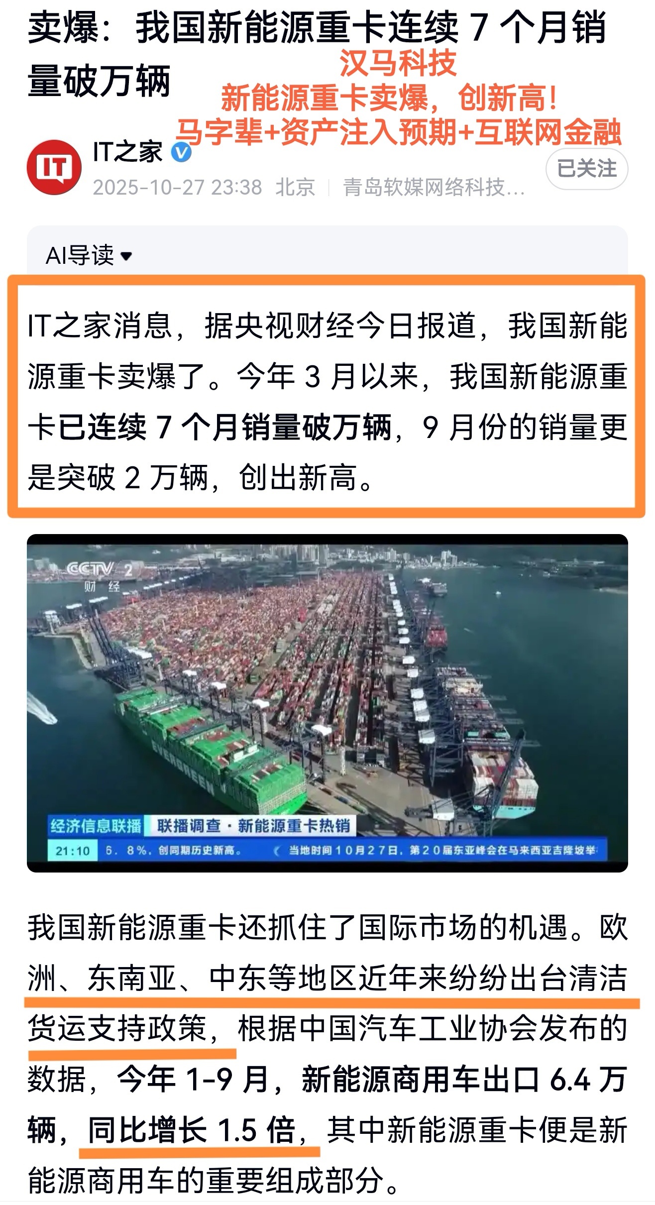 汉马科技,新能源重卡卖爆(清洁货运)+马字辈+资产注入预期+互联网金融