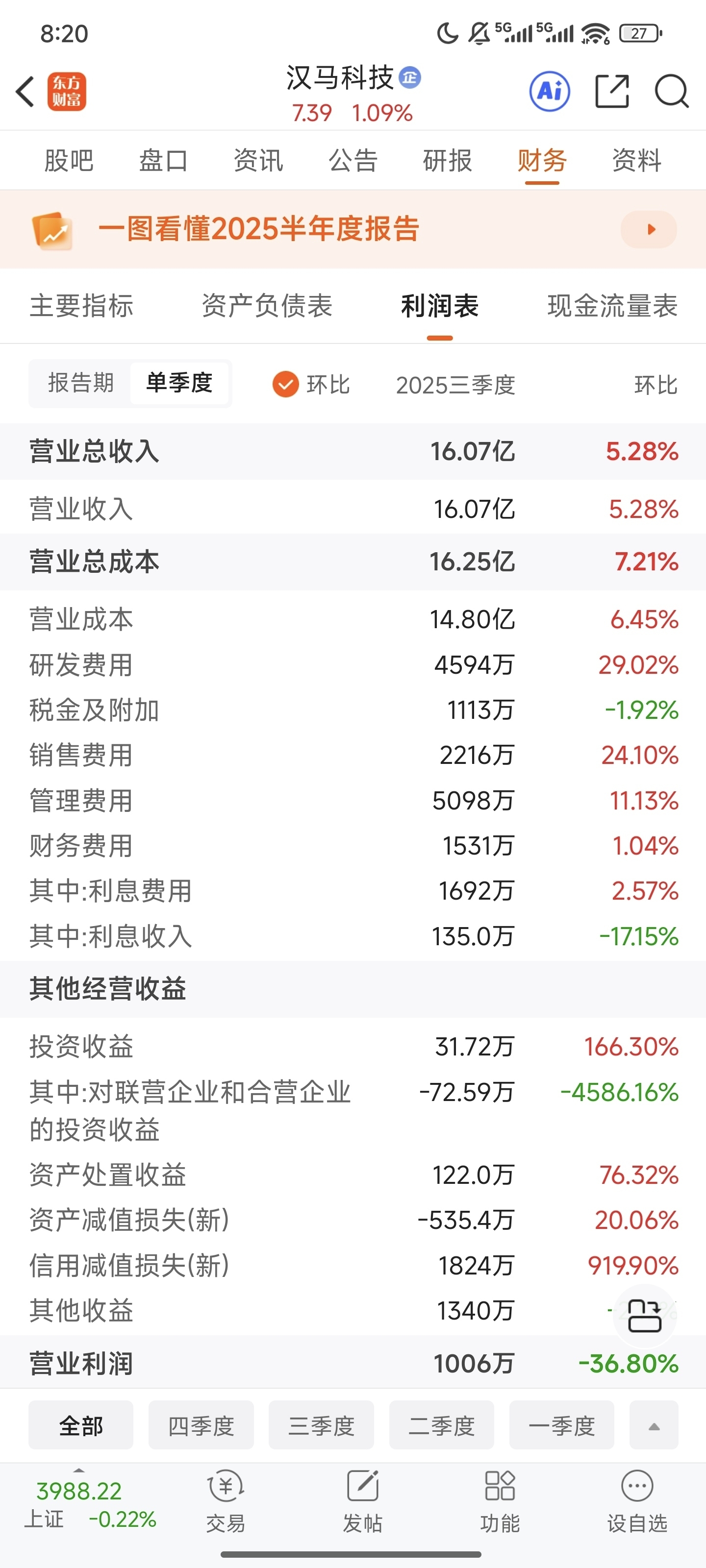 $汉马科技(SH600375)$ 研究了一下利润表,这期利润只能说符合预期。利润率略微下降,研发费用环比增长了29%,资产新减值了500万,导致最后净利润不算高。