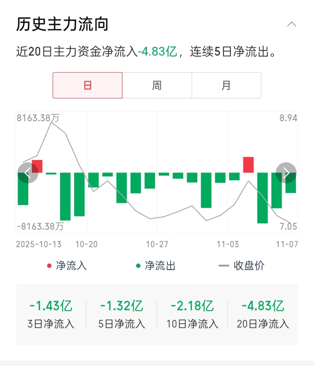 主力近期呈持续流出状态,阴跌不止
