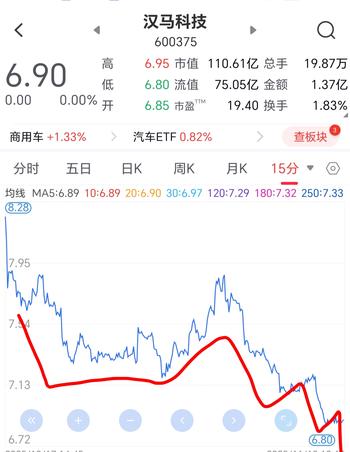 $汉马科技(SH600375)$ 看十五分钟线就很清楚了,高点逐步下移动,低点也逐步下移。