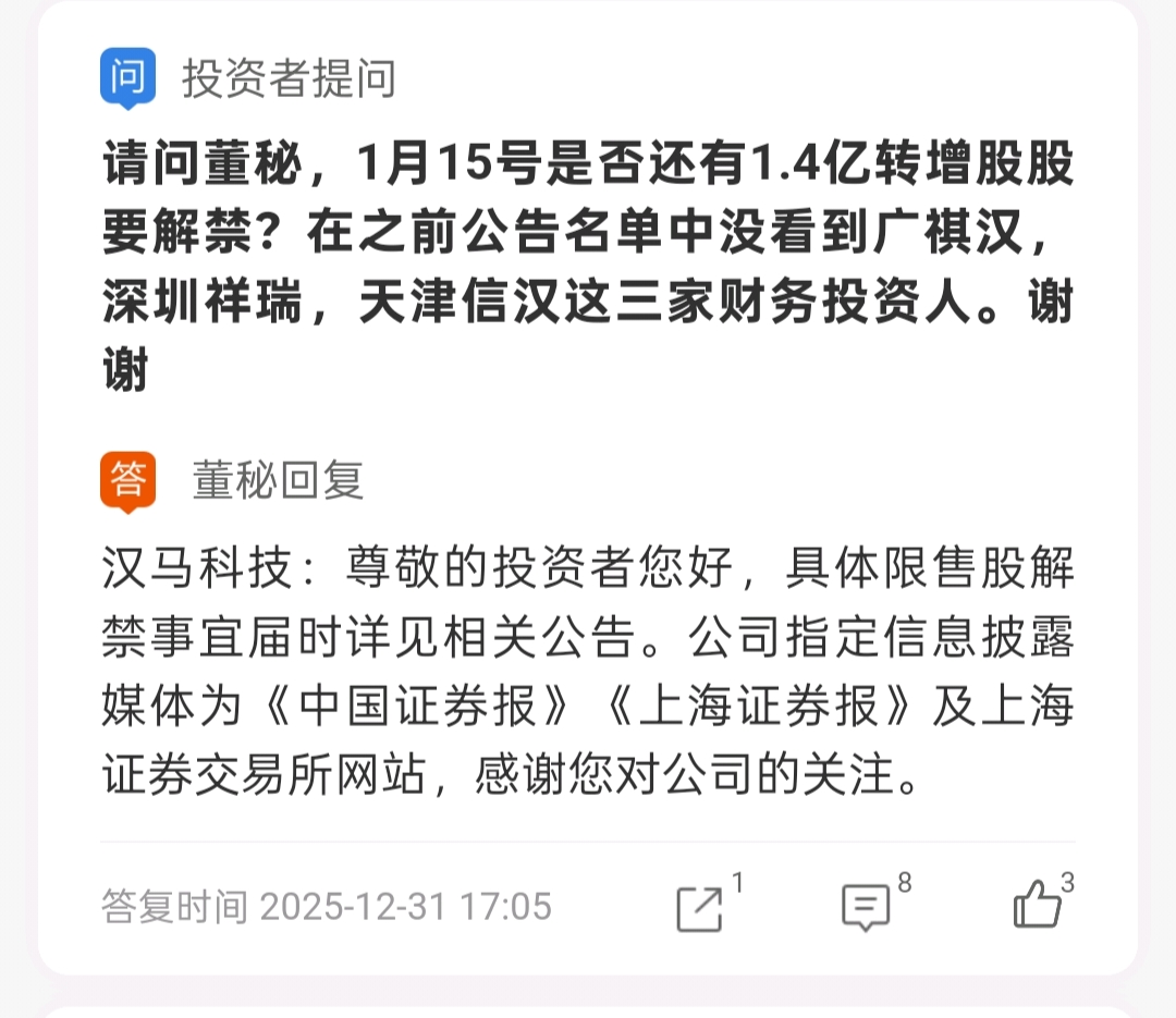 $汉马科技(SH600375)$ 明晚将出解禁公告,加上指数振荡,即将大回调,请注意风险