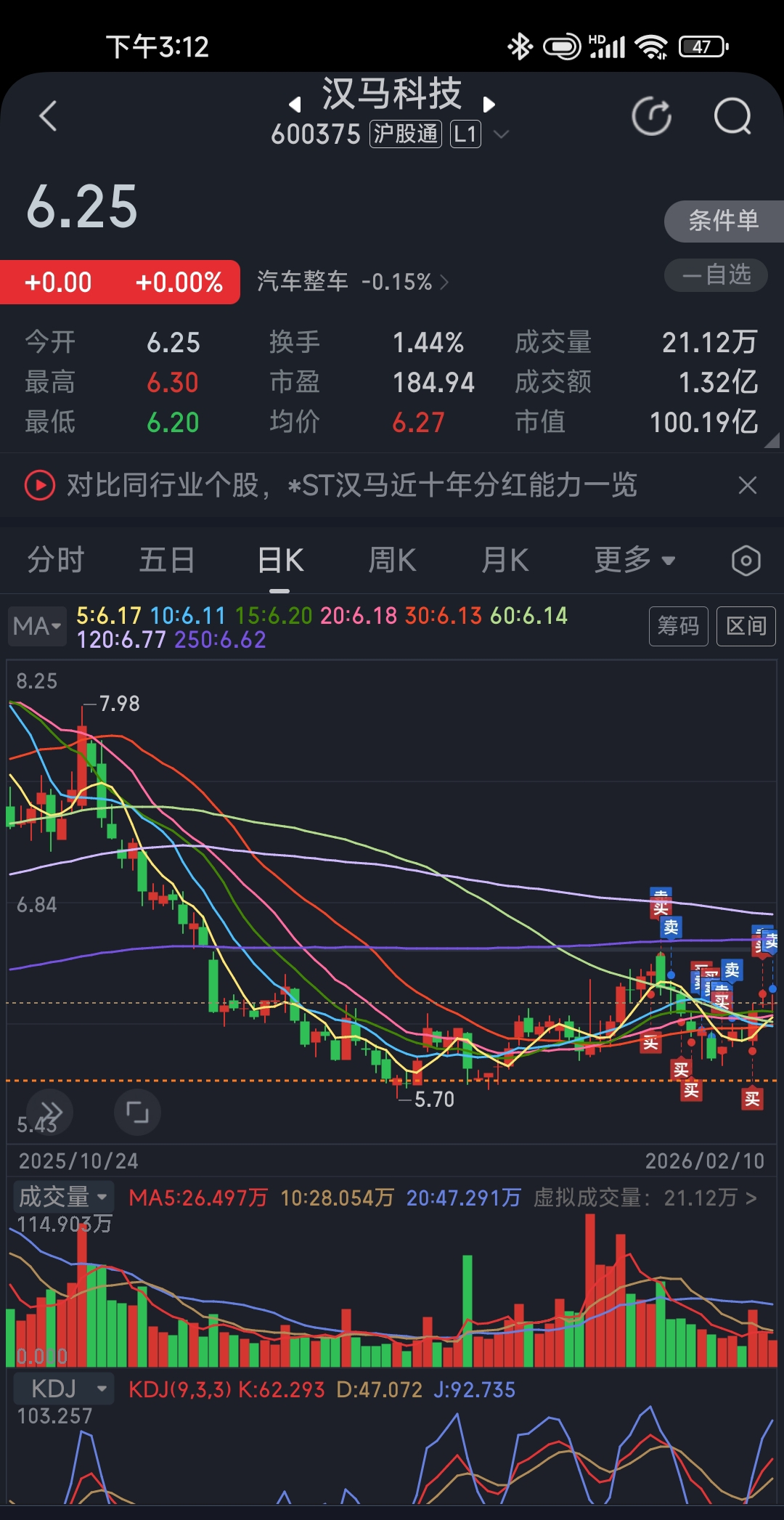 $汉马科技(SH600375)$ 汗血宝马奔跑不起来啊,冲高回落只好减仓,这段时间连续加仓做T,减仓后成本已降到5.80,接下来不到6.18以下就不考虑加仓了。