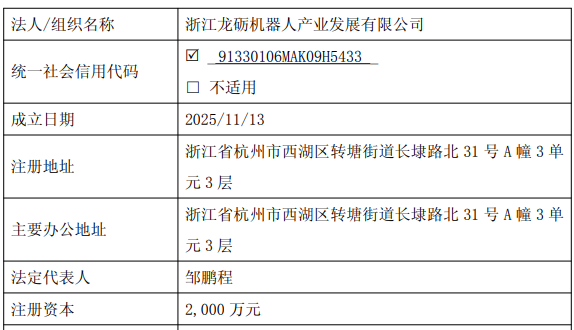 值得注意的是,受让方龙砺机器人成立于2025年11月13日,注册资本2000万元,主营业务包含工业机器人销售等。