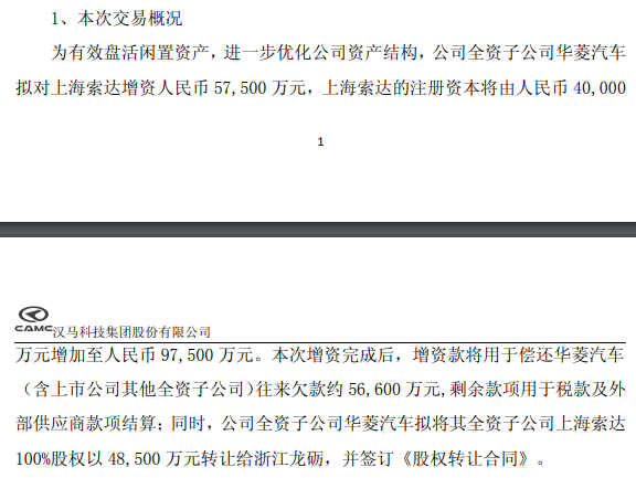 2月10日,汉马科技(600375)发布公告,为有效盘活闲置资产,进一步优化公司资产结构,公司全资子公司华菱汽车拟对其全资子公司上海索达传动机械有限公司增资5.75亿元。上海索达的注册资本将由4亿元增至9.75亿元。