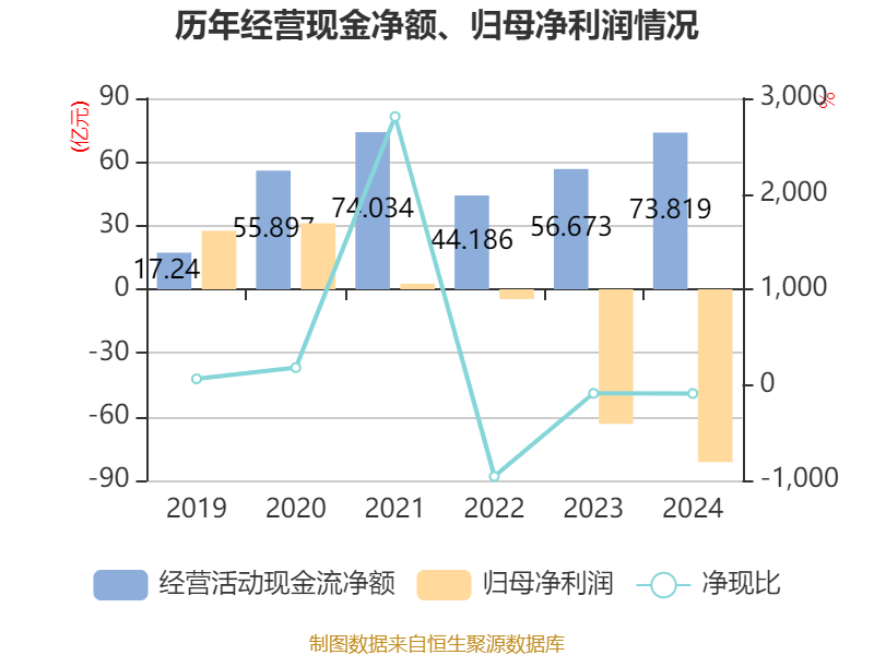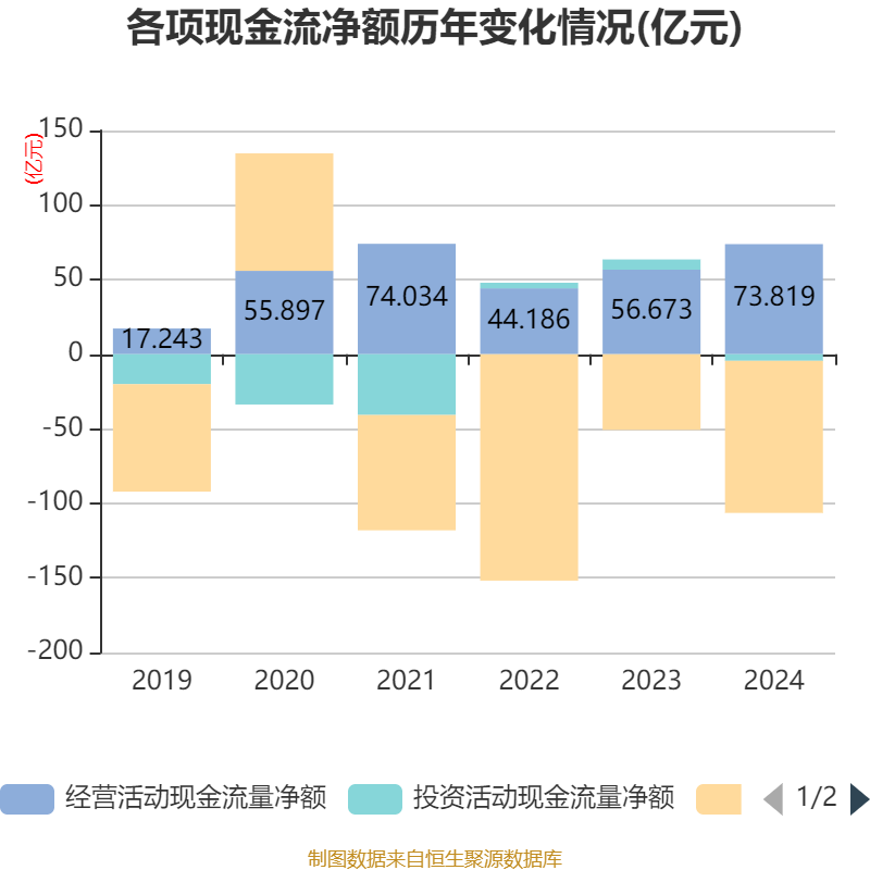 截至2024年,公司经营活动现金流净额为73.82亿元,同比增长30.25%;筹资活动现金流净额-101.98亿元,同比减少51.22亿元;投资活动现金流净额-4.43亿元,上年同期为6.85亿元。