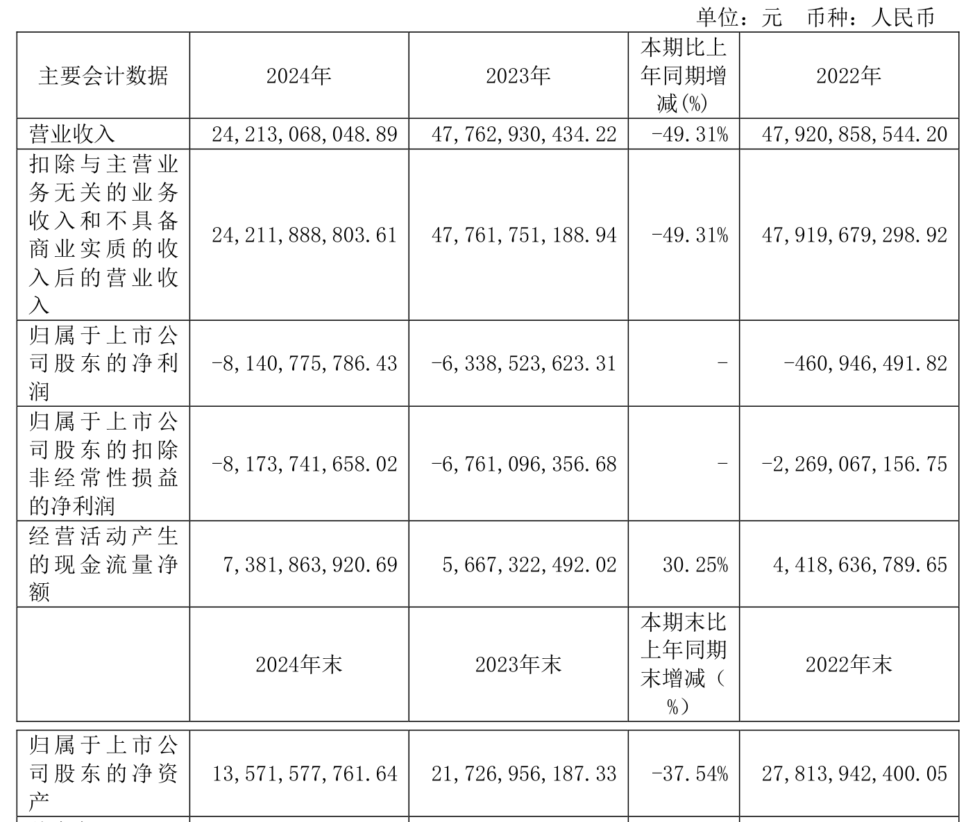 中证智能财讯首开股份(600376)4月23日披露2024年年度报告。2024年,公司实现营业总收入242.13亿元,同比下降49.31%;归母净利润亏损81.41亿元,上年同期亏损63.39亿元;扣非净利润亏损81.74亿元,上年同期亏损67.61亿元;经营活动产生的现金流量净额为73.82亿元,同比增长30.25%;报告期内,首开股份基本每股收益为-3.2411元,加权平均净资产收益率为-59.98%。