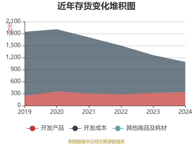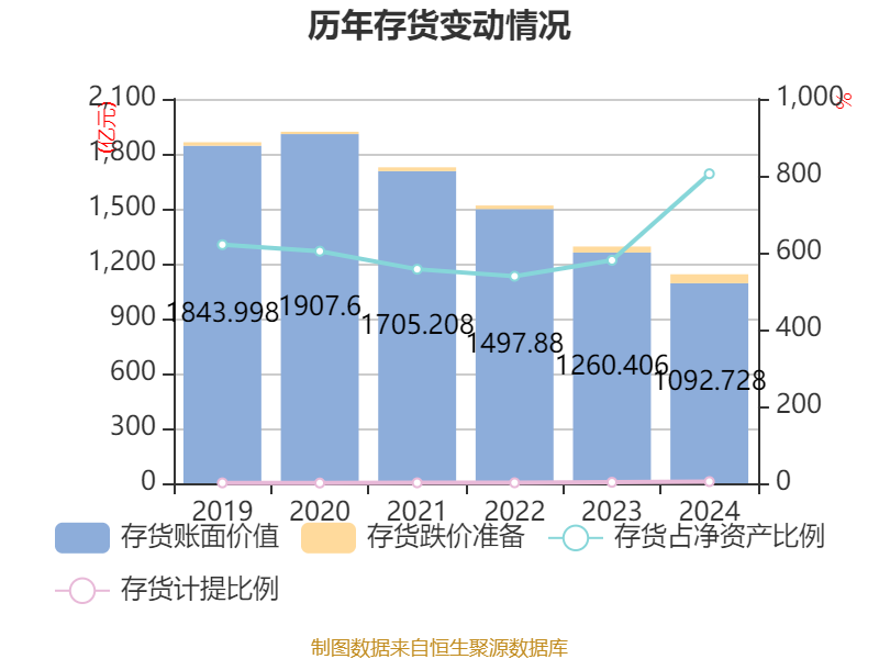 从存货变动来看,截至2024年末,公司存货账面价值为1092.73亿元,占净资产的805.16%,较上年末减少167.68亿元。其中,存货跌价准备为49.05亿元,计提比例为4.3%。