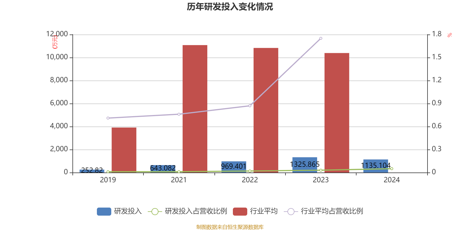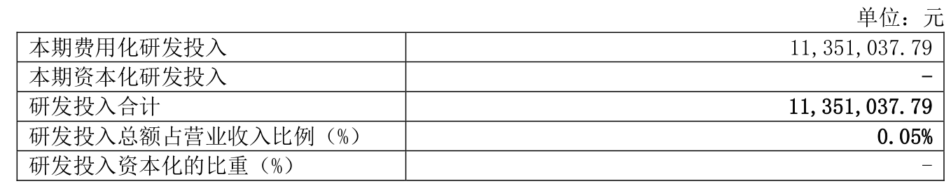 2024年全年,公司研发投入金额为1135.1万元,同比下降14.39%;研发投入占营业收入比例为0.05%,相比上年同期上升0.02个百分点。此外,公司全年研发投入资本化率为0%。