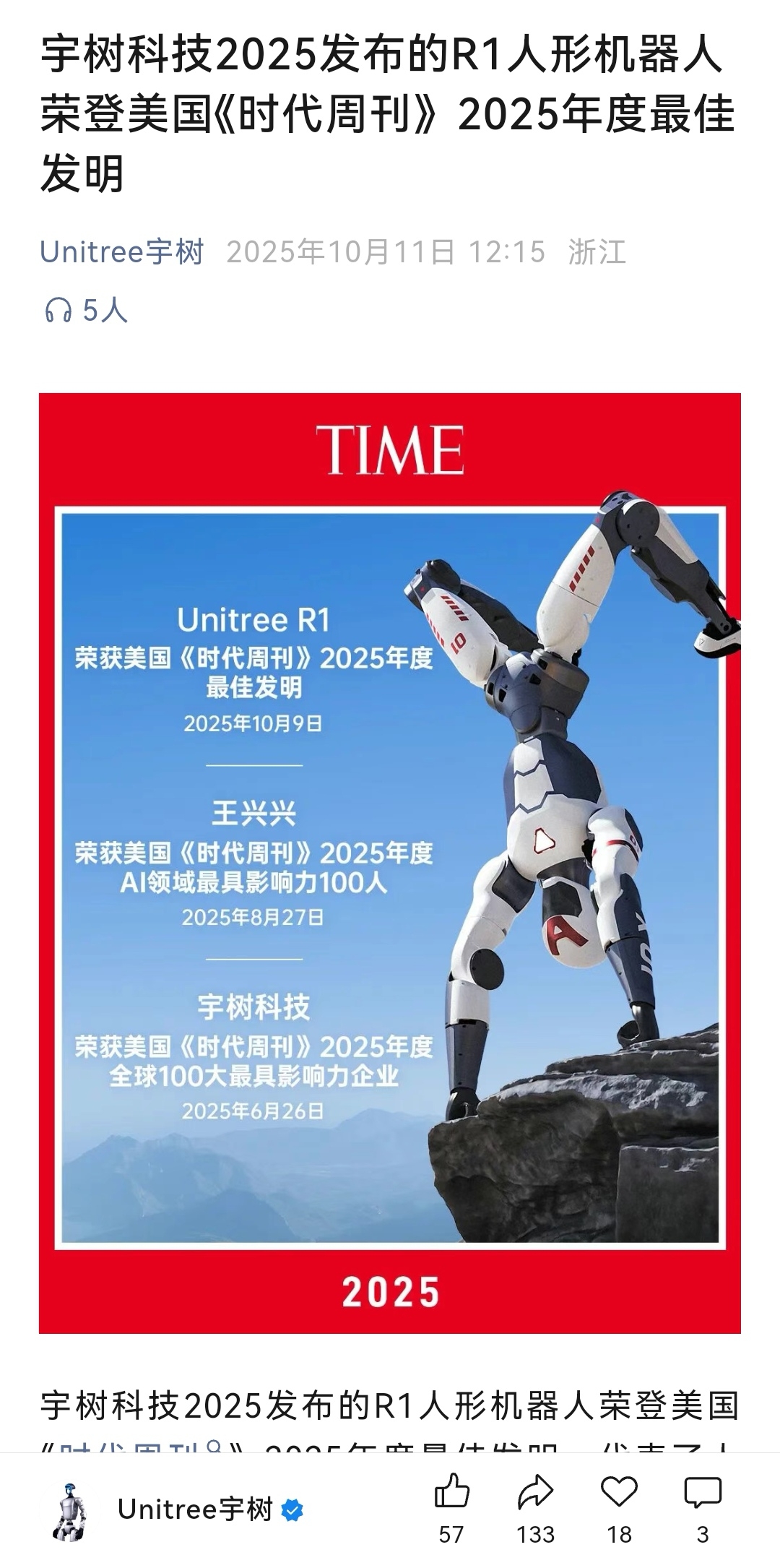 宇树科技2025发布的R1人形机器人荣登美国《时代周刊》2025年度最佳发明