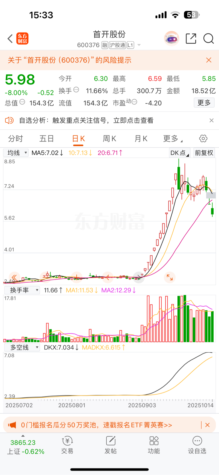 $首开股份(SH600376)$ 明天如果还跌的话,估计会有一群人崩溃掉,在此股能盈利的只有挂买卖单直接不看,收盘再看,不然上串下跳会扰乱思绪,如果觉得他能到8块直接挂8块卖出,中间如何波动不管他,要是不相信他有双头直接卖出删自选即可,不过首开倒了,外面不见得赚到钱,如果割完首开,去外面还被收割,那就得不偿失了