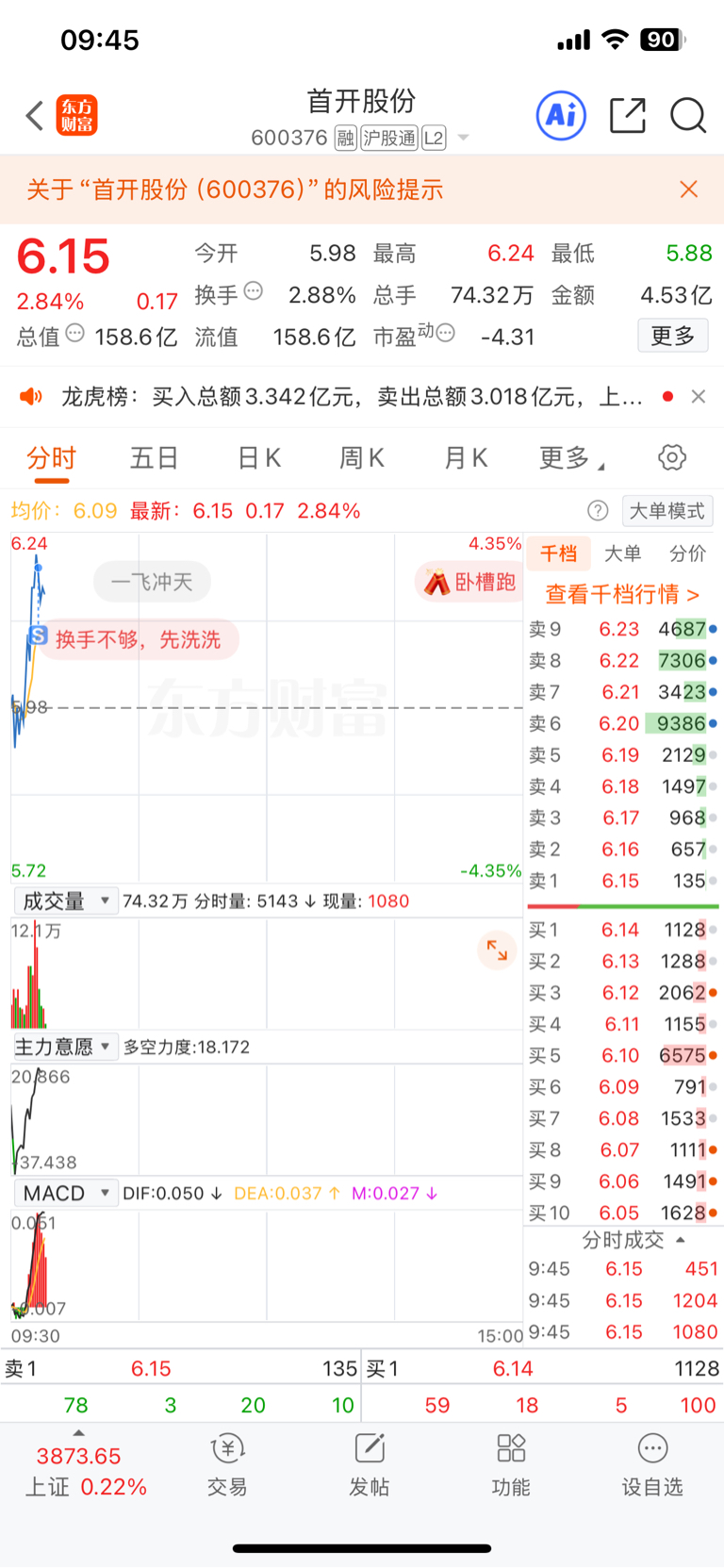 $首开股份(SH600376)$ 昨天跌停买的,获利5个点,不贪