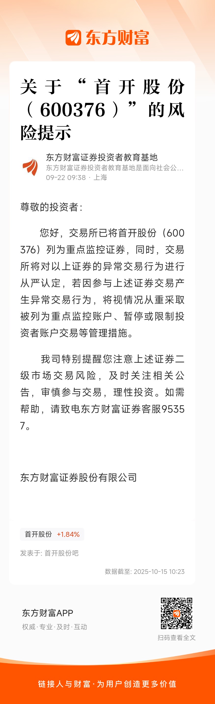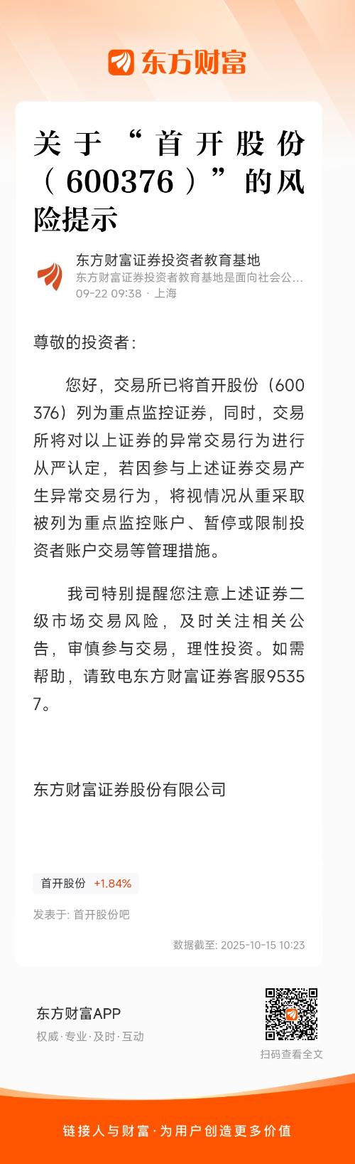您好,交易所已将首开股份(600376)列为重点监控证券,同时,交易所将对以上证券的异常交易行为进行从严认定,若因参与上述证券交易产生异常交易行为,将视情况从重采取被列为重点监控账户、暂停或限制投资者账户交易等管理措施。