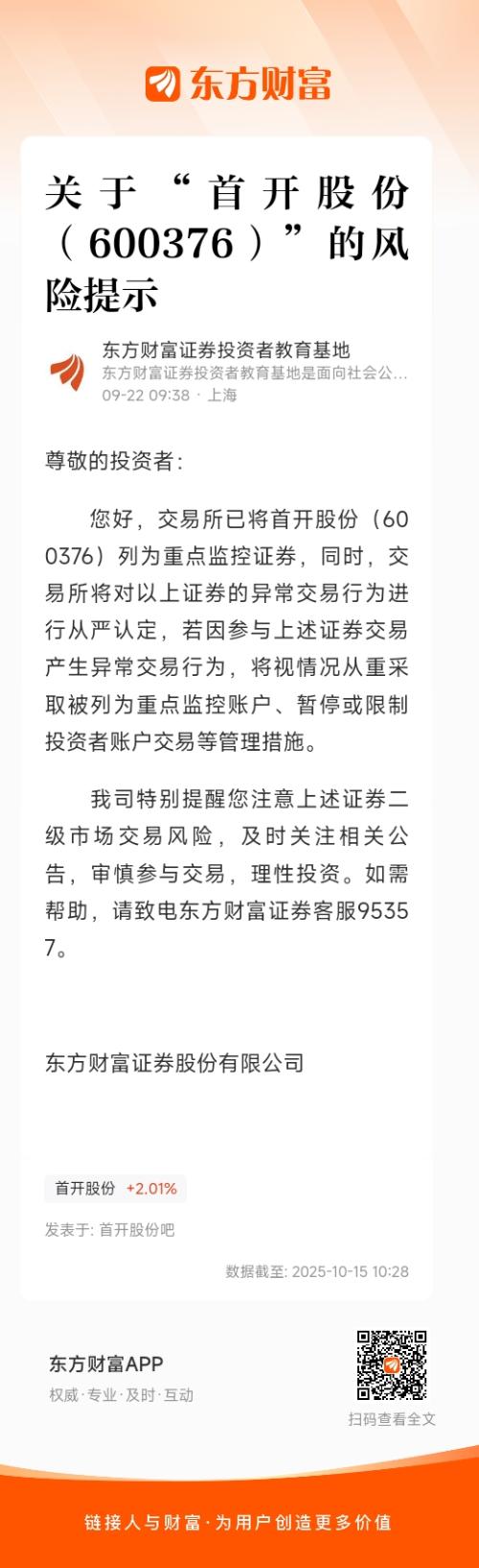 您好,交易所已将首开股份(600376)列为重点监控证券,同时,交易所将对以上证券的异常交易行为进行从严认定,若因参与上述证券交易产生异常交易行为,将视情况从重采取被列为重点监控账户、暂停或限制投资者账户交易等管理措施。