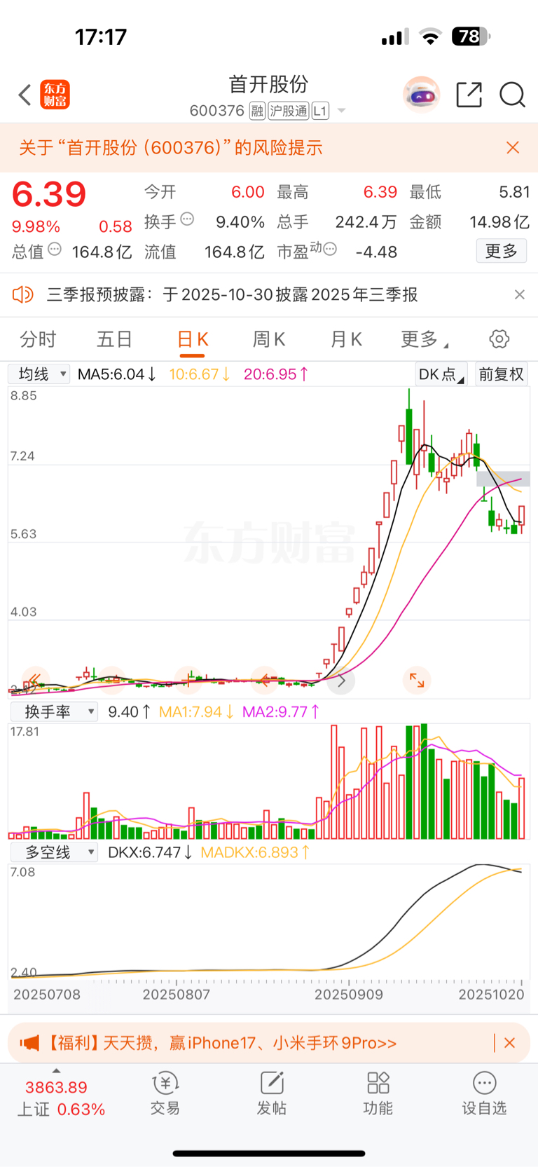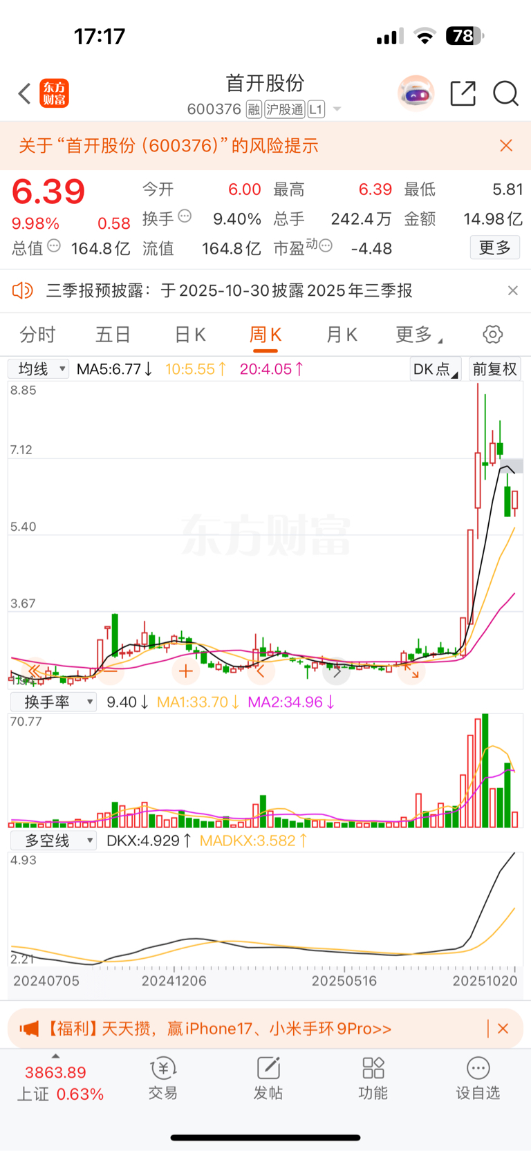 $首开股份(SH600376)$ 还在监管内,今天首开偏向套利吧,周线真难看,上周如果来个涨停,周线都没那么难看,接下来应该震荡吧,涨上去不会一跃而就,别追涨杀跌哦!首开套起人可是有一套!