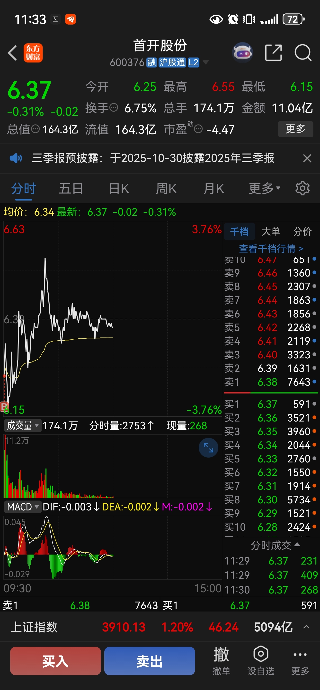 $首开股份(SH600376)$ 午间点评:什么是龙头?龙头就是不怕你买,也不怕你卖,来去自由。今日逢低买回底仓,与主力同行。时刻关注大有能源。