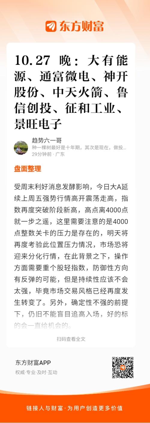 受周末利好消息发酵影响,今日大A延续上周五强势行情高开震荡走高,指数再度突破阶段新高,高点离4000点就一步之遥,这里需要注意的是4000点整数关卡的压力是存在的,明天将再度考验此位置压力情况,市场恐将迎来分化行情,在此背景之下,操作方面需要重个股轻指数,防御性方向有反弹的可能,但是持续性应该不会太强,毕竟市场交易风格已经再度发生转变了。另外,确定性不强的前提下,仍旧不能盲目追高入场,好的标的会一直给机会的。