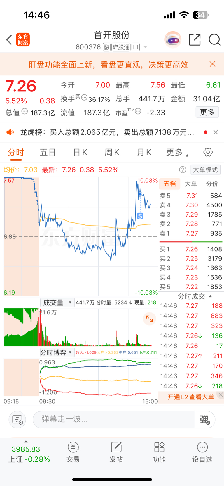 $首开股份(SH600376)$ 卖了等下来接。跟沪股通做T 。沪股通喜欢T