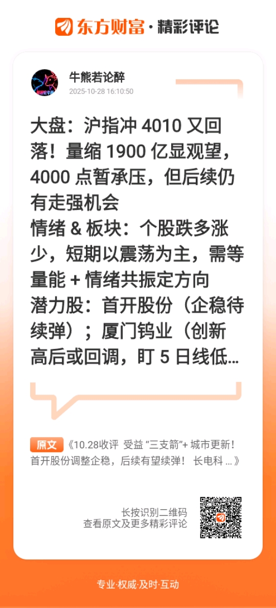 昨晚美股三大指数全线反弹,叠加盘后利好,原预判今日 A 股续弹破 4000 点,但早盘三大指数全部低开(理解为洗盘),早盘出局者或有后悔。今日指数虽反弹(最高触 4010 点),但量能缩小 1900 多亿,核心因市场对 4000 点与 3900 点走势相似存观望情绪,午后回落进一步验证谨慎心态。不过整体逻辑不变:当前走势与前期类似,后续仍有走强可能,若指数续升,观望资金有望进场。
