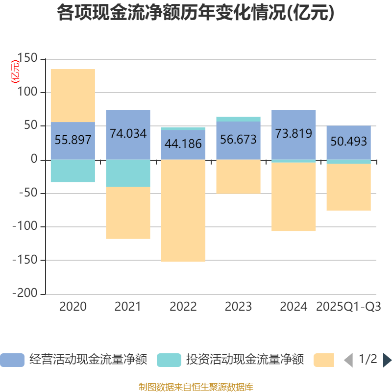 2025年前三季度,公司经营活动现金流净额为50.49亿元,同比增加75.21亿元;筹资活动现金流净额-69.78亿元,同比减少18.65亿元;投资活动现金流净额-6.06亿元,上年同期为-6.97亿元。