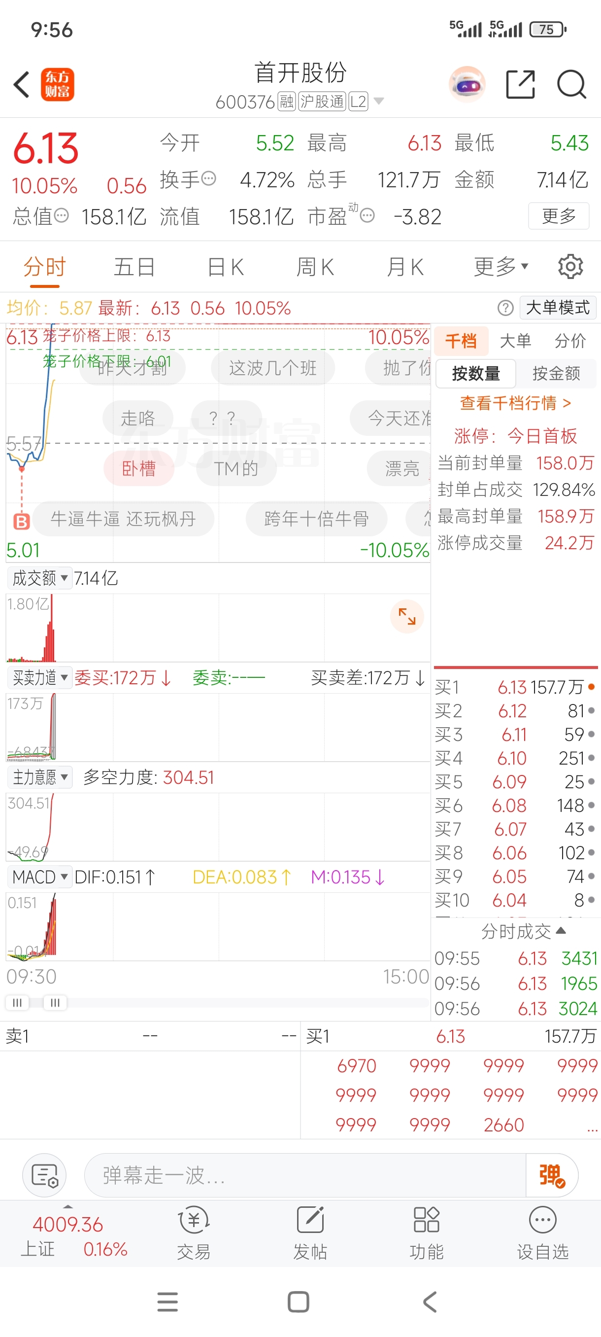 $首开股份(SH600376)$ 均价5.5买入1.8万股,5.62出了1.6万股,套的太深,慢慢降低成本
