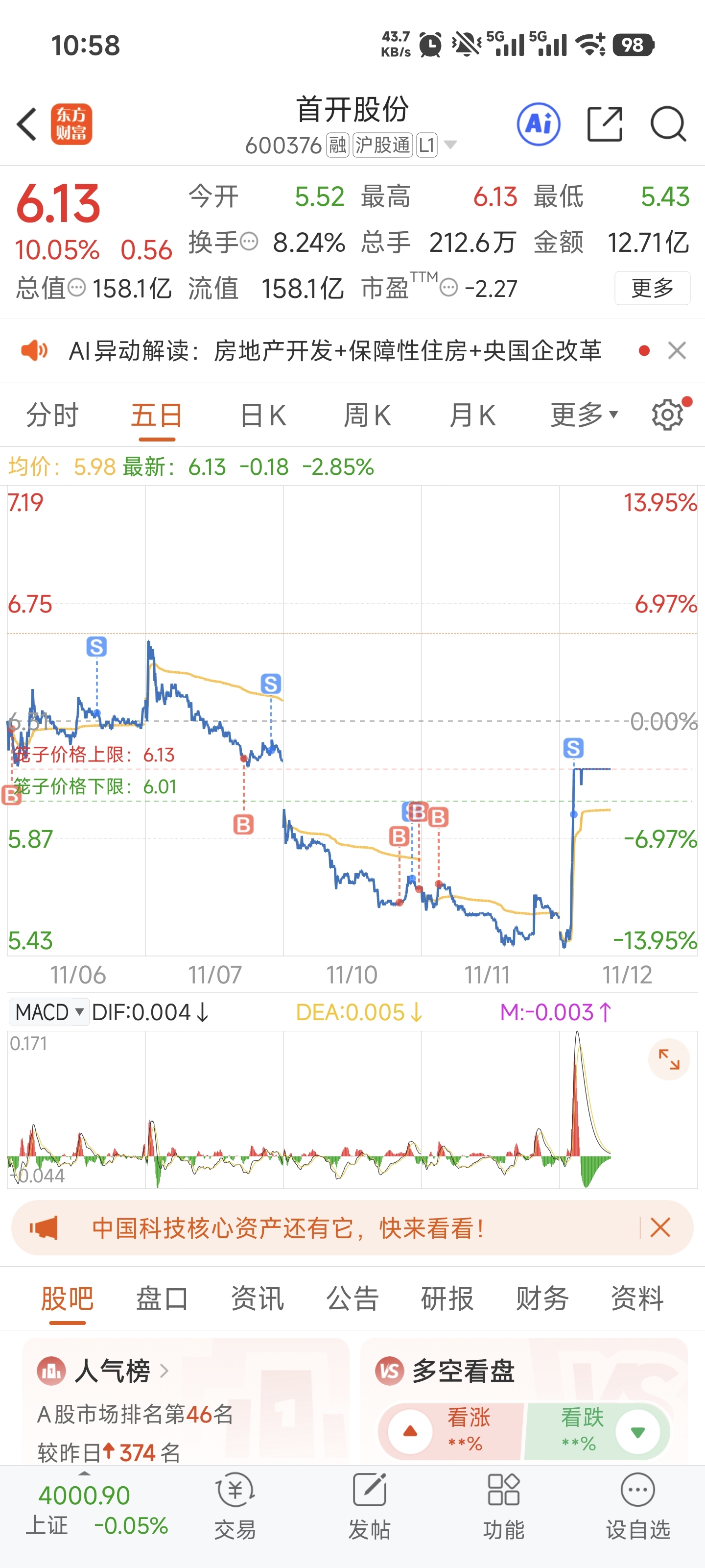 $首开股份(SH600376)$ 搞不好是超跌反弹!!!明天又接着阴跌!