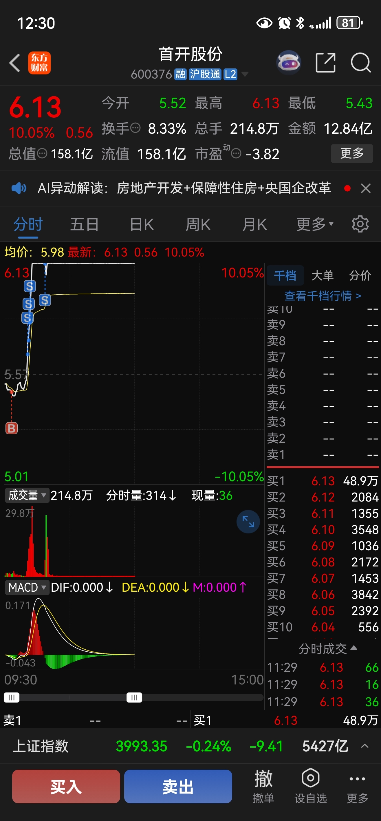 $首开股份(SH600376)$ 午盘点评:放量封板确认短期底部5.5,盘中开口显示主力坚定程度稍欠,后续高度还需观察,明日若缩量续板则后市可期。操作上逢高卖出,卖飞也无遗憾,盈利就好。