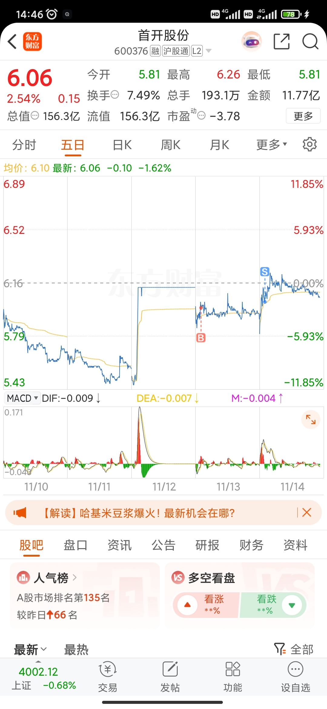 $首开股份(SH600376)$ 5.99买的,6.03卖的