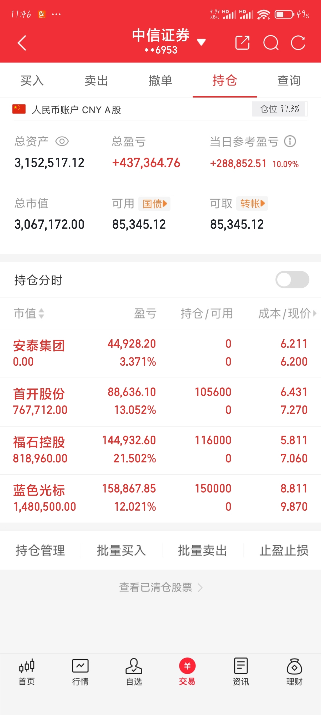 大家上午好,来感谢一下今日持仓:早上给安泰集团给止盈出局了及时落袋为安