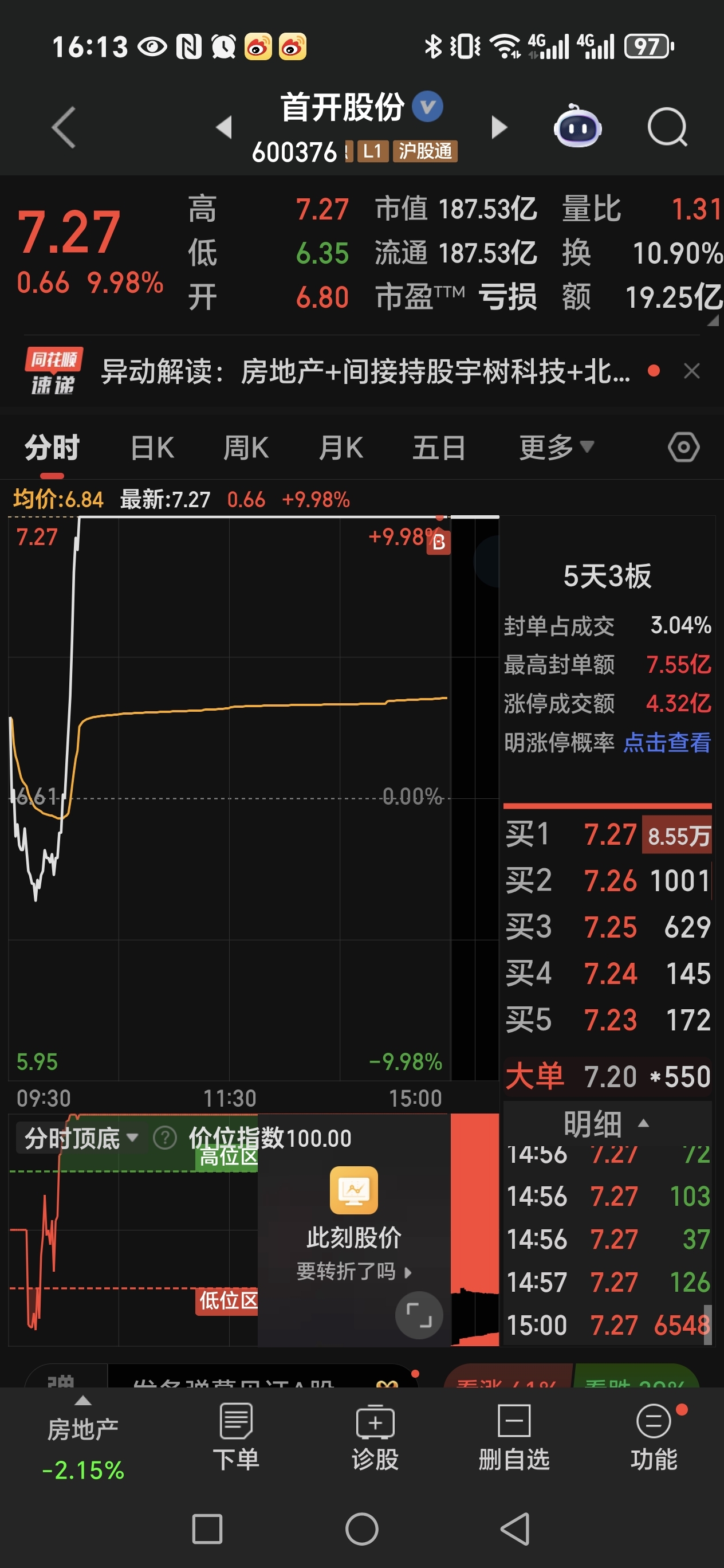 $首开股份(SH600376)$ 10点12挂的委托,买进去了,感觉明天不太妙啊。