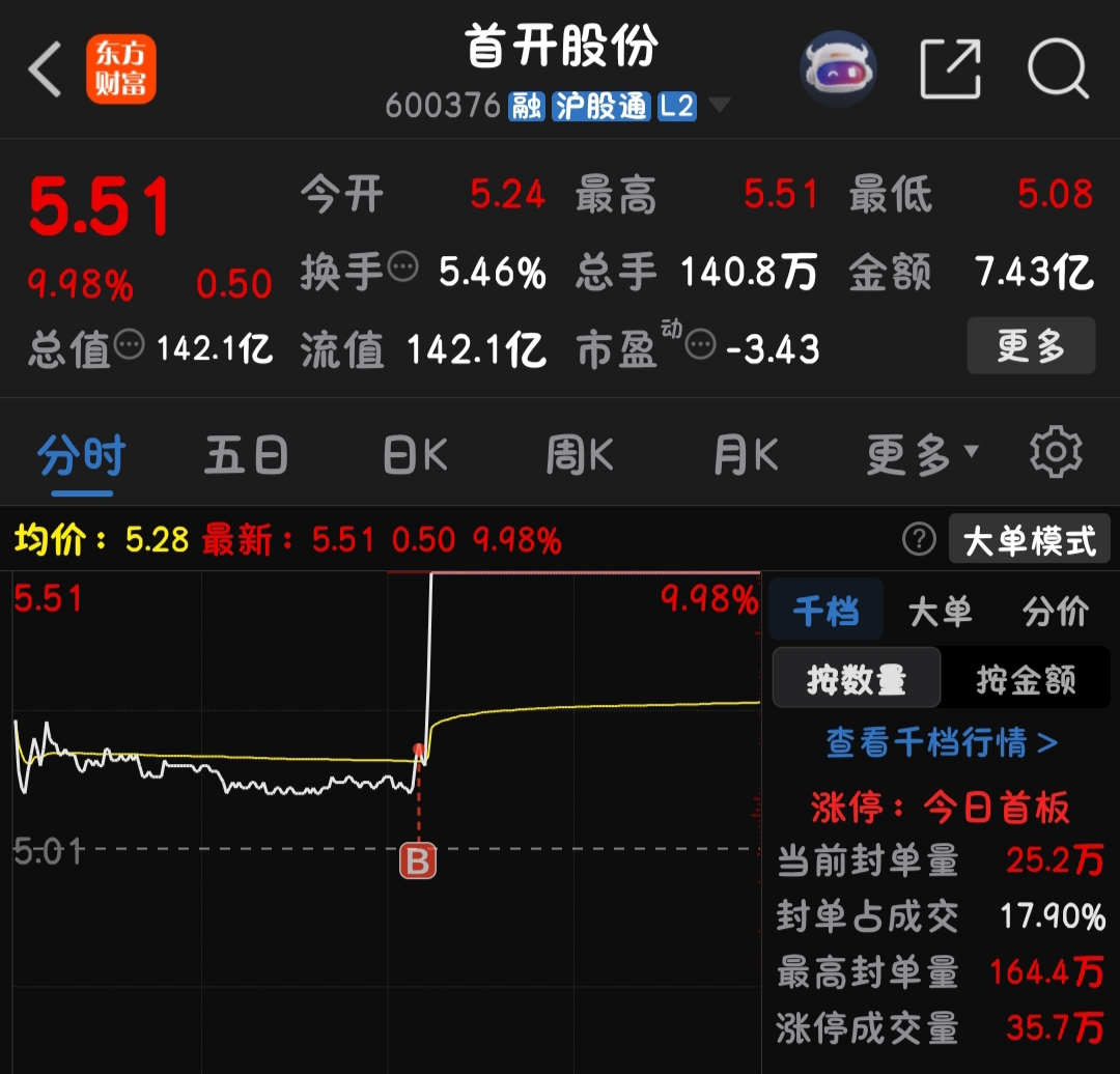 $首开股份(SH600376)$ 不涨停就5.3/5.8震荡