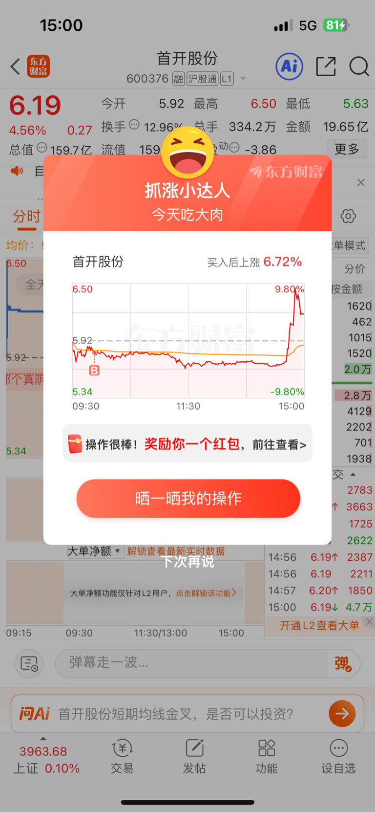 早上从其他票看过来的,买了一点,下午就涨,星期一能板吗