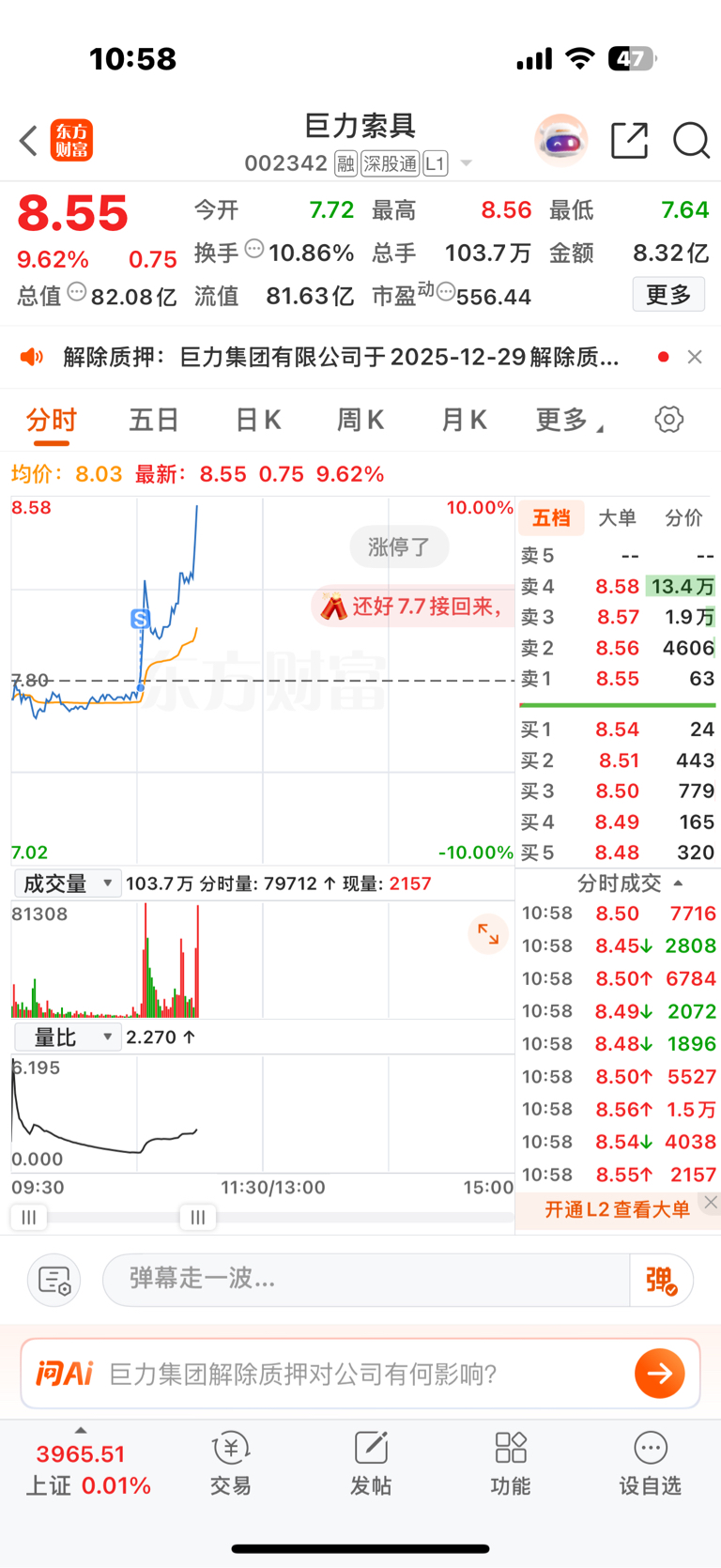 7.77卖了巨力索具买了你哭死。一秒涨停