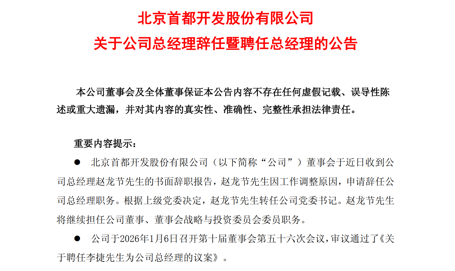 发布业绩亏损之前,首开股份宣布换帅。公司总经理赵龙节转任公司党委书记,申请辞任公司总经理职务。同为70后的公司常务副总经理、董事李捷升任总经理。按照三年任期,赵龙节距离任满仅剩不到半年时间。