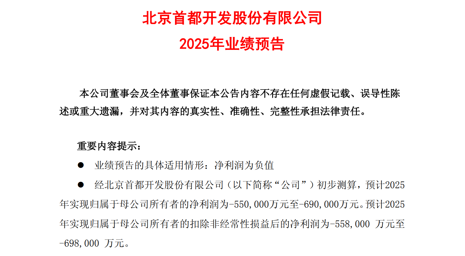 对于连年亏损的首开股份来说,成本的节省非常重要。公司不久前发布的业绩预告显示,公司预计2025年实现归属于母公司所有者的净利润为-55亿元至-69亿元。