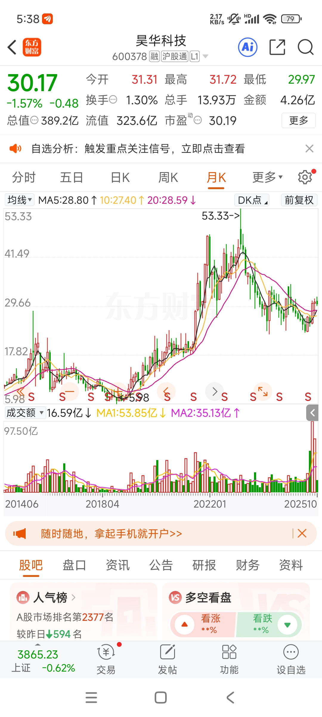 当下每天换手不到4%,我猜想前期把昊华拉十倍的主力没跑干净,我就等跌多了买点,主