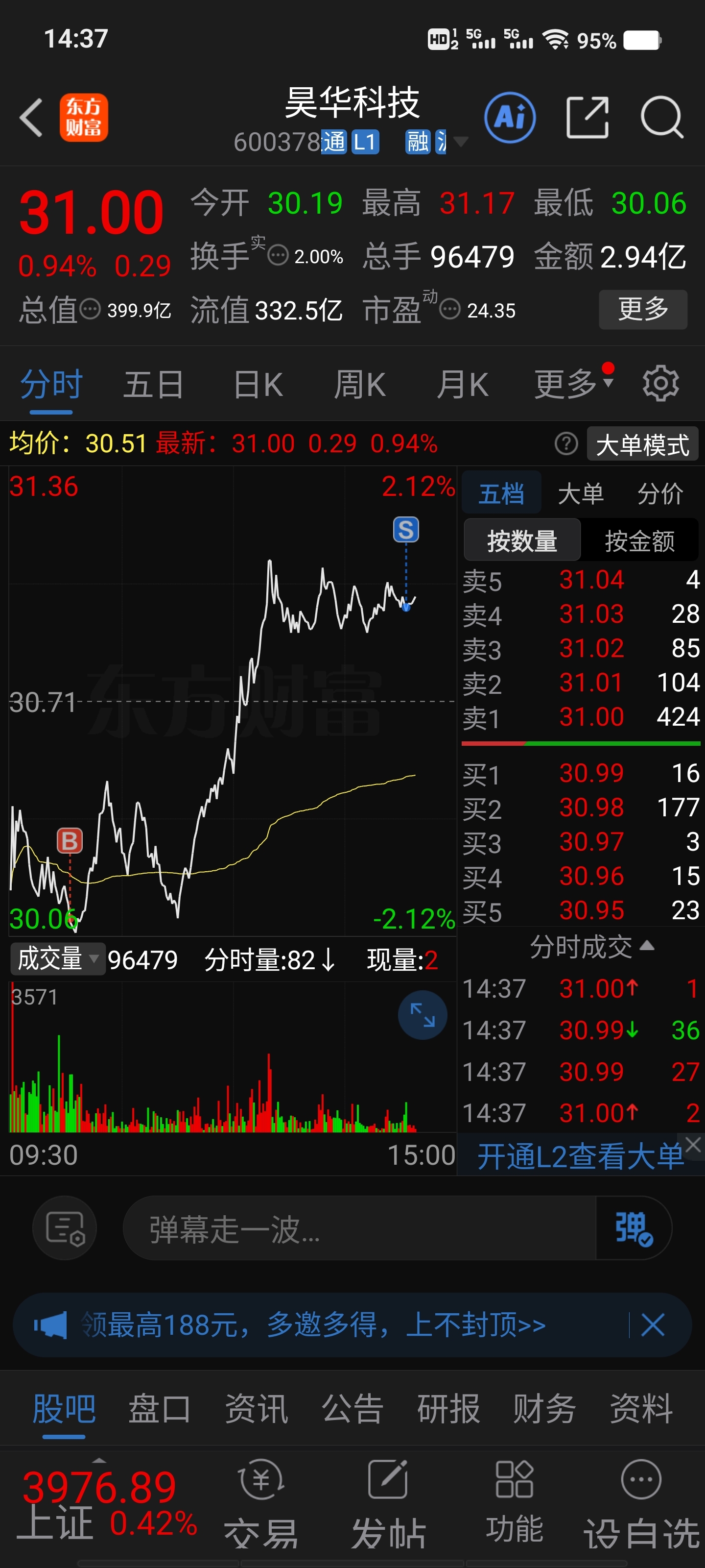 $昊华科技(SH600378)$ 30.3以下只买不卖,31以上只卖不买