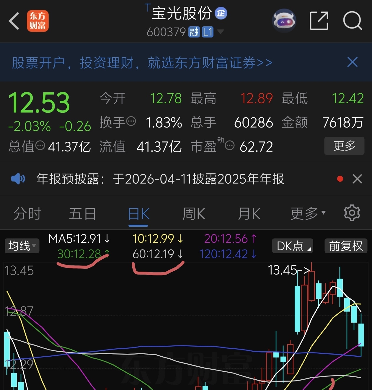 今天正好跌到半年线12.42,老铁们30日或者60日线做反抽