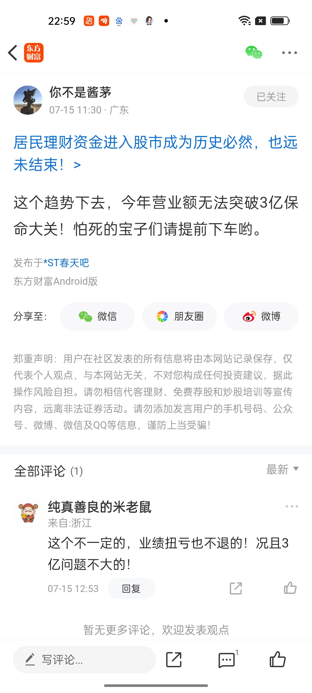温馨提示: 1.根据《证券法》规定,禁止编造、传播虚假信息或者误导性信息,扰乱证券市场;2.用户在本社区发表的所有资料、言论等仅代表个人观点,与本网站立场无关,不对您构成任何投资建议。用户应基于自己的独立判断,自行决定证券投资并承担相应风险。《东方财富社区管理规定》